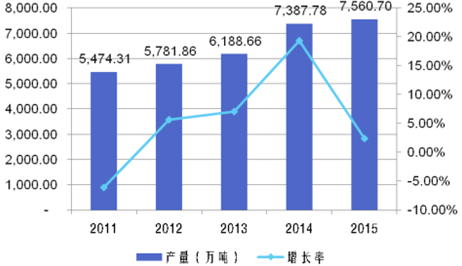 2011-2015 年我(wo)國塑料制(zhì)品産量及(jí)增長率情(qíng)況